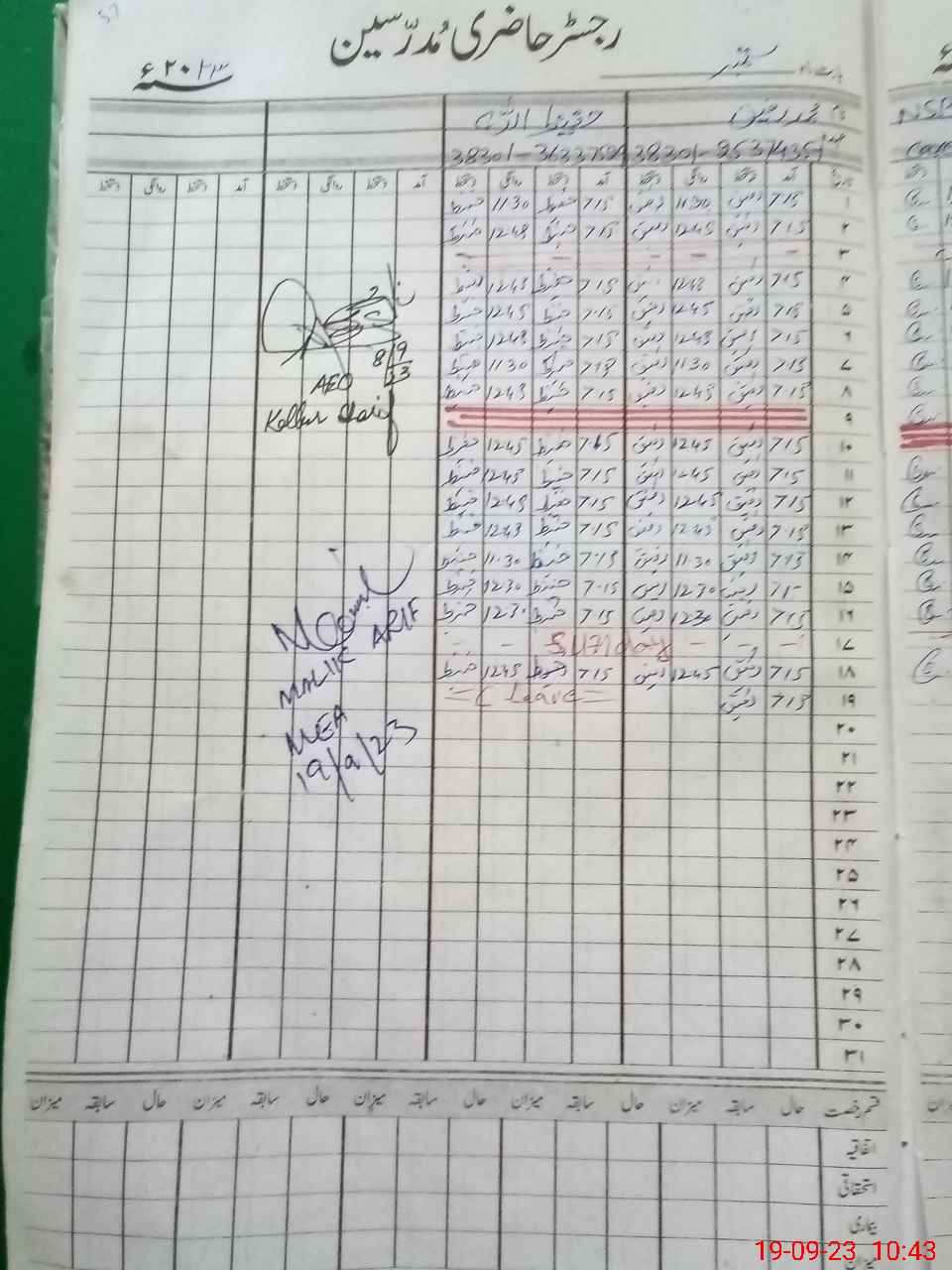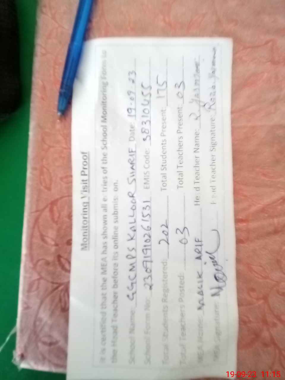 | Attendance Register | Head Teacher | MEA with School | Visit Proof |