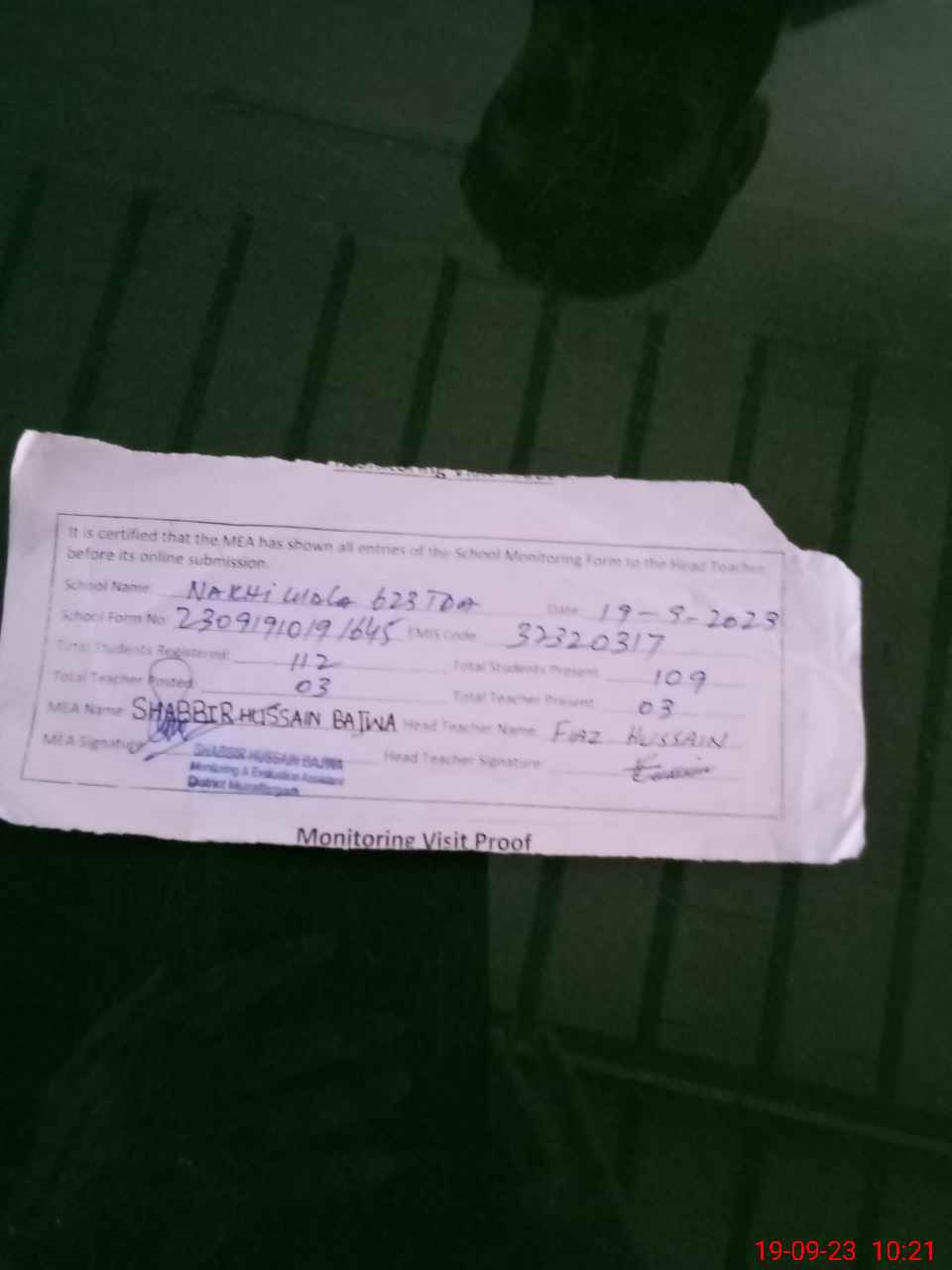 | Attendance Register | Head Teacher | MEA with School | Visit Proof |