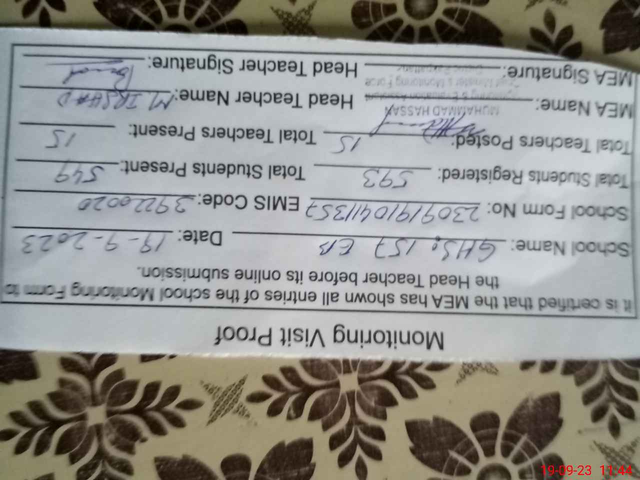 | Attendance Register | Head Teacher | MEA with School | Visit Proof |