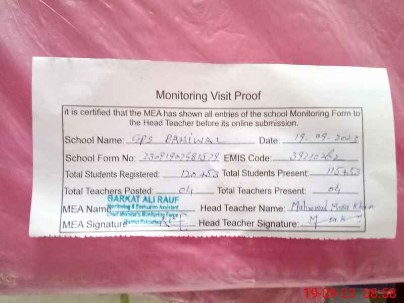 | EMIS Code: 39210262 | Name of School: GPS BAHIWAL | |||