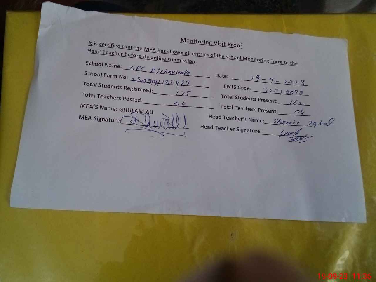 | Attendance Register | Head Teacher | MEA with School | Visit Proof |