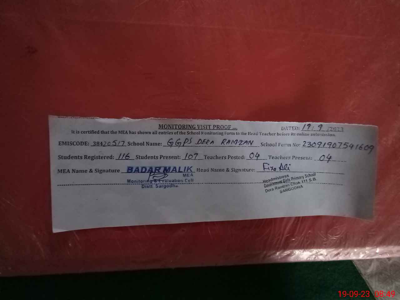 | Attendance Register | Head Teacher | MEA with School | Visit Proof |