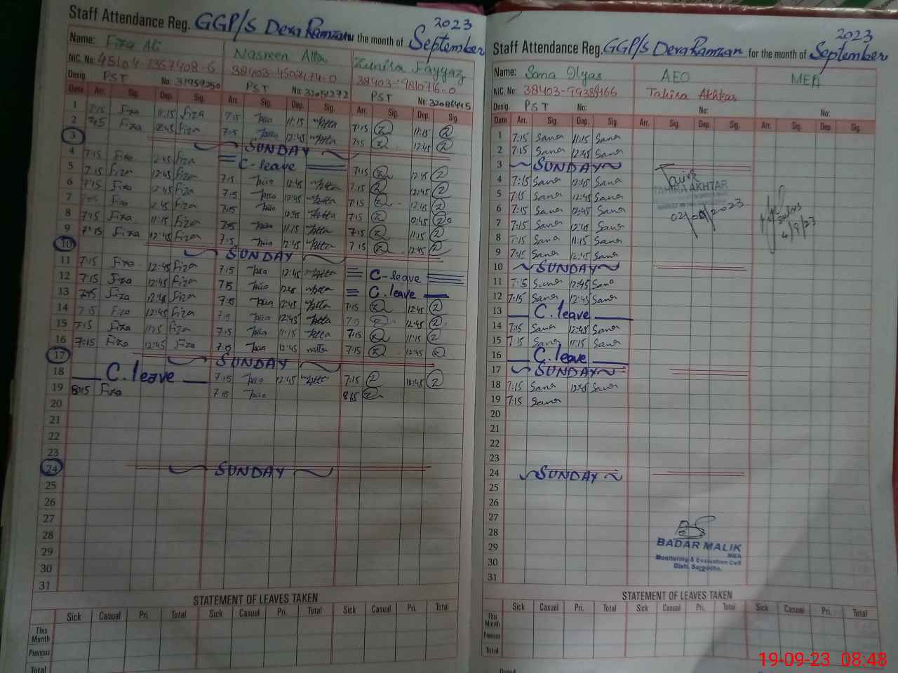| CNIC | Full Name | Designation | R/C | Absence During Last Calender Month |