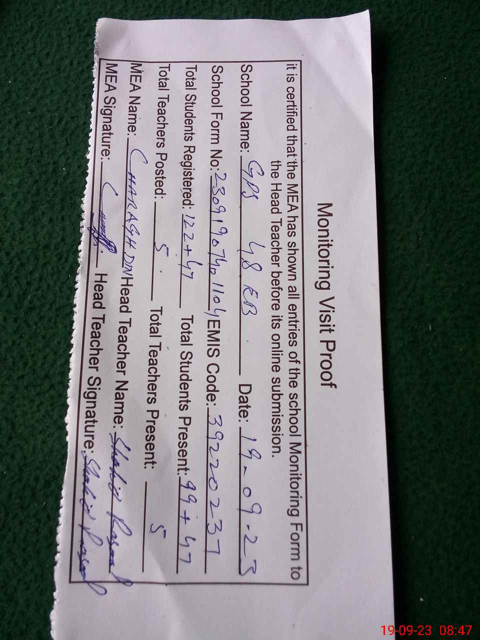 | Attendance Register | Head Teacher | MEA with School | Visit Proof |