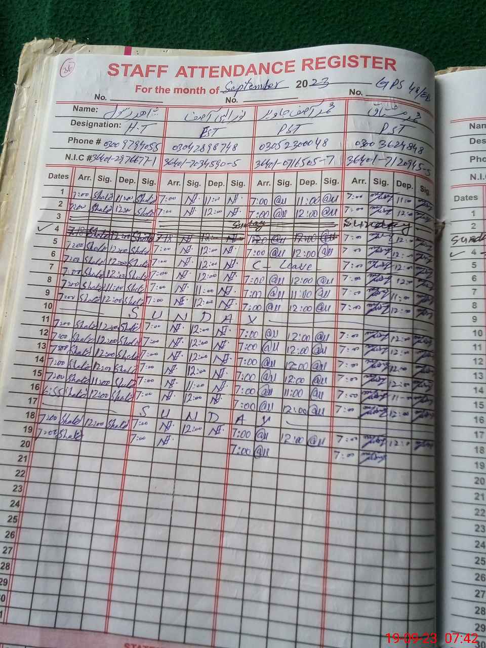 | CNIC | Full Name | Designation | R/C | Absence during last cal. month |