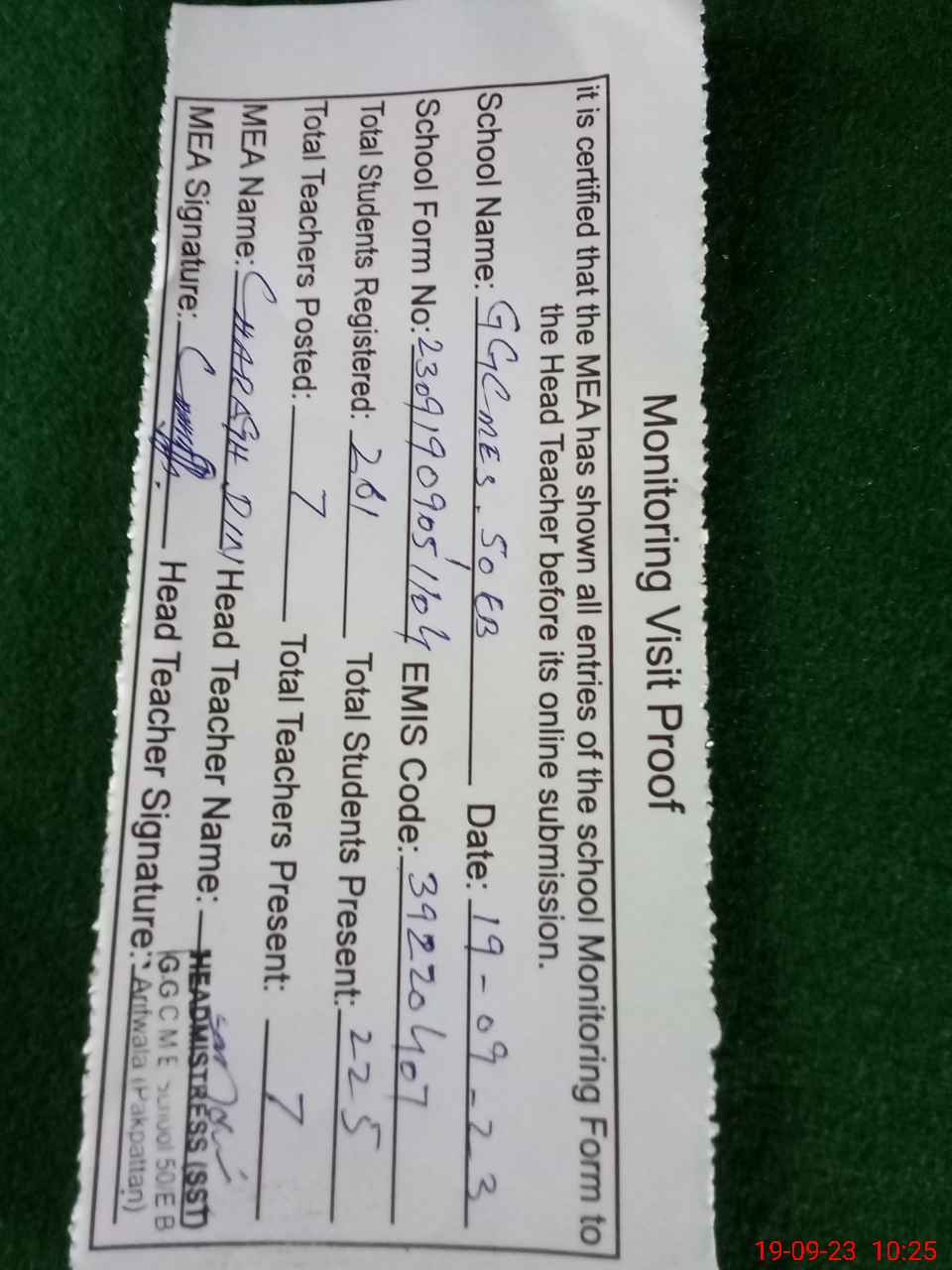 | Certified that this School was Inspected by the Undersigned MEA/DMO Today and the Information Stated Above is as Per Record. | |||||