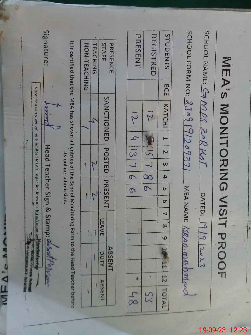 | Attendance Register | Head Teacher | MEA with School | Visit Proof |