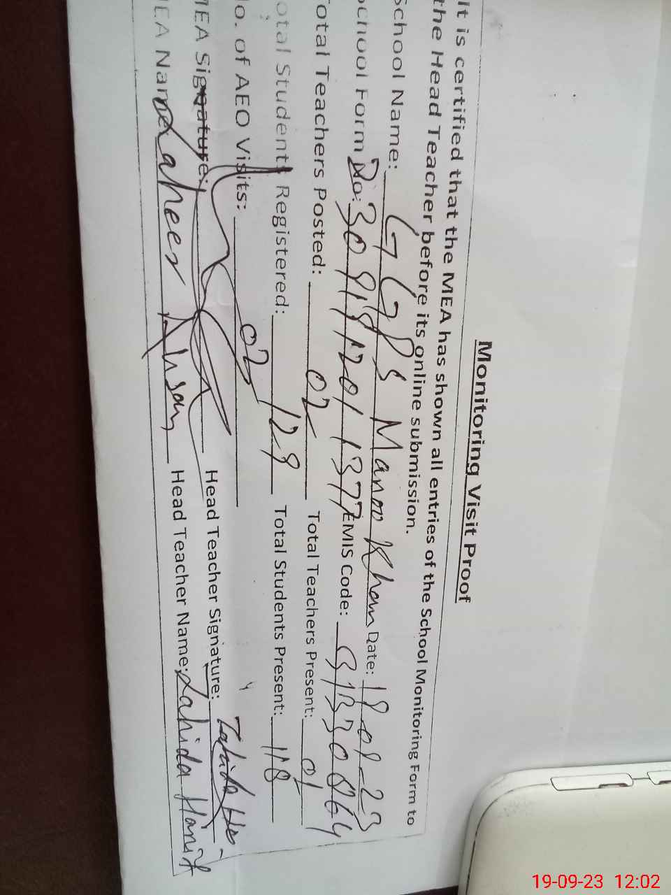 | Attendance Register | Head Teacher | MEA with School | Visit Proof |