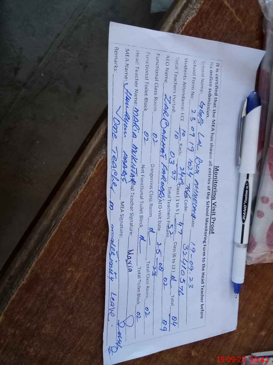 | Attendance Register | Head Teacher | MEA with School | Visit Proof |