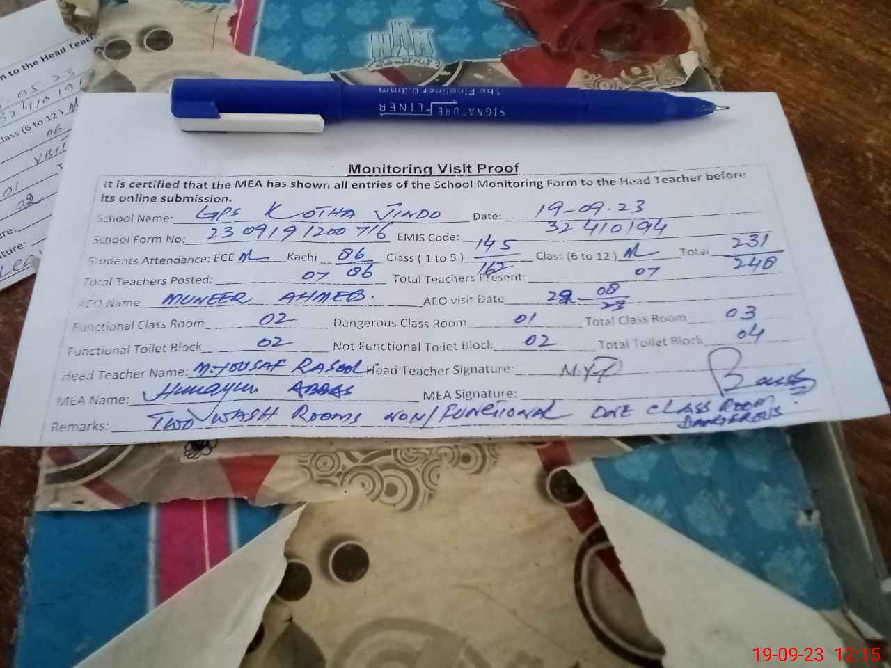 | Remarks (Use Separate Page if Required): TWO WASH ROOMS NON FUNCTIONAL one class room dangerous overall cleaness good | |||||