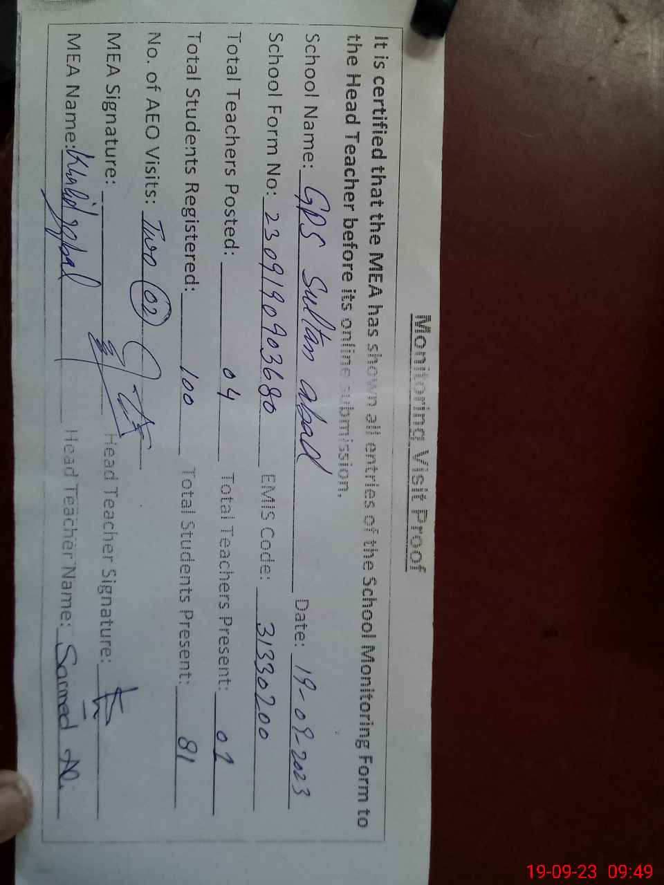 | EMIS Code: 31330200 | Name of School: GPS SULTAN ABAD | |||