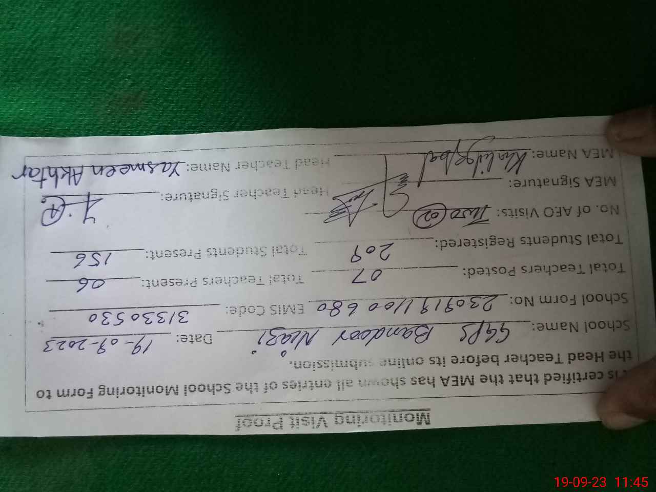 | Attendance Register | Head Teacher | MEA with School | Visit Proof |