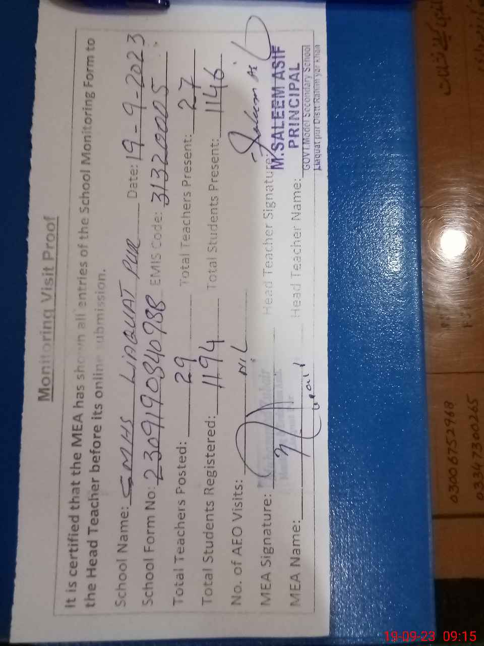 | Name: M.**** AS**** Designation: (School Headmaster's/Headmistress's) PRINCIPAL Phone/Cell Number: 03**** |