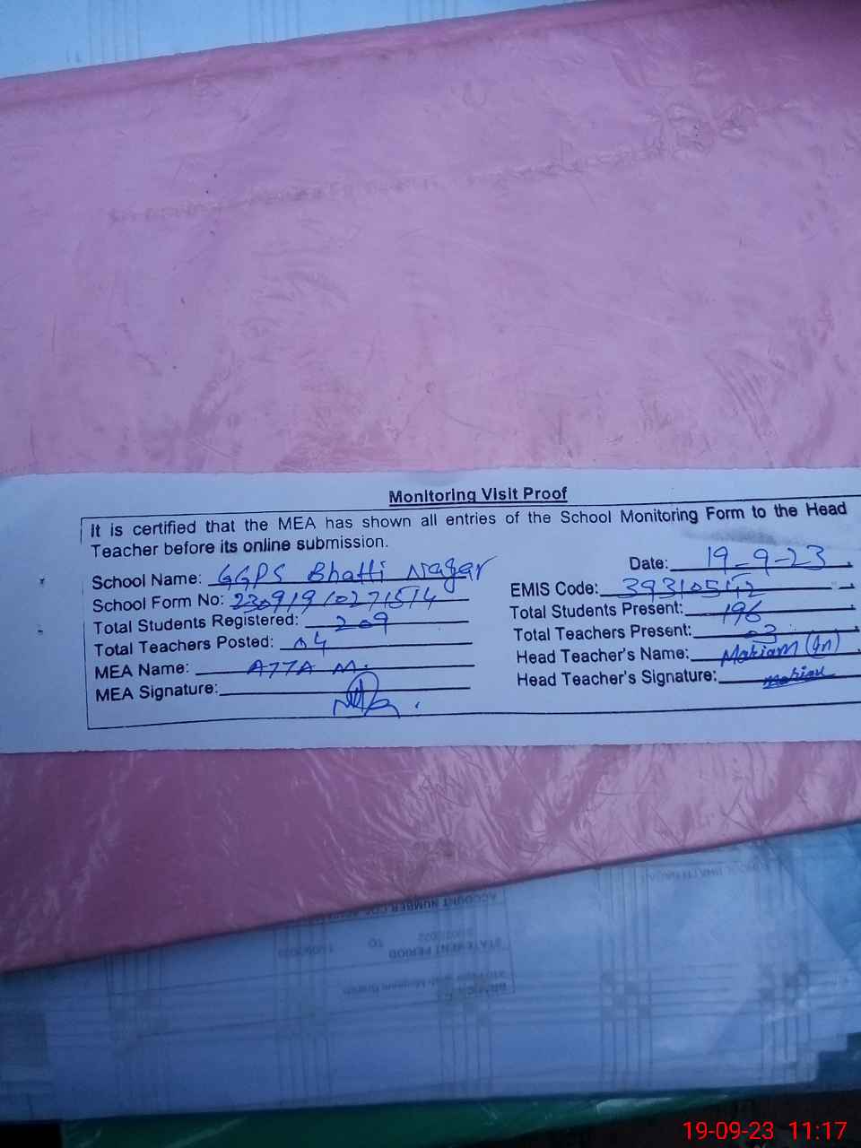 | Attendance Register | Head Teacher | MEA with School | Visit Proof |