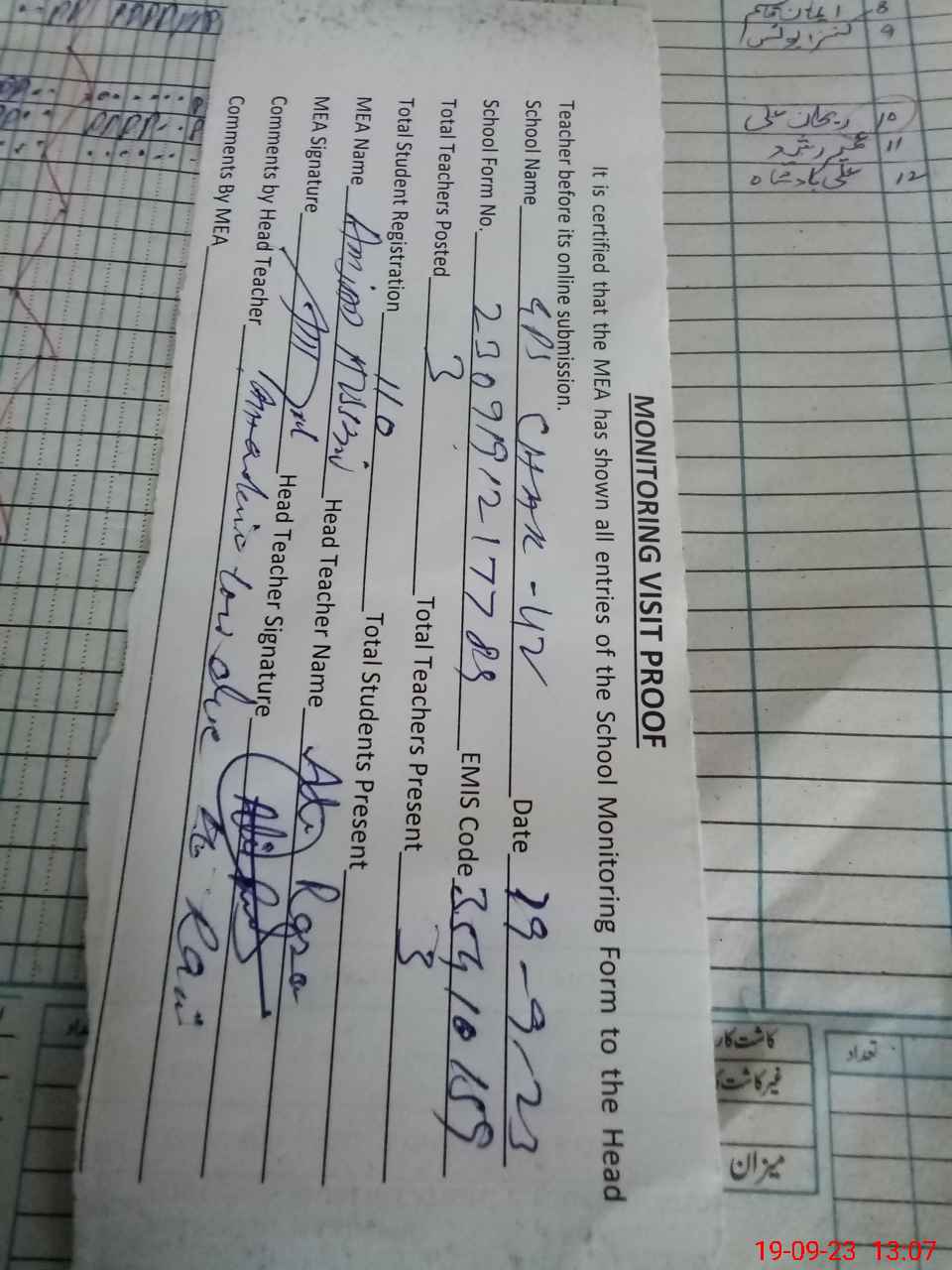 | Attendance Register | Head Teacher | MEA with School | Visit Proof |