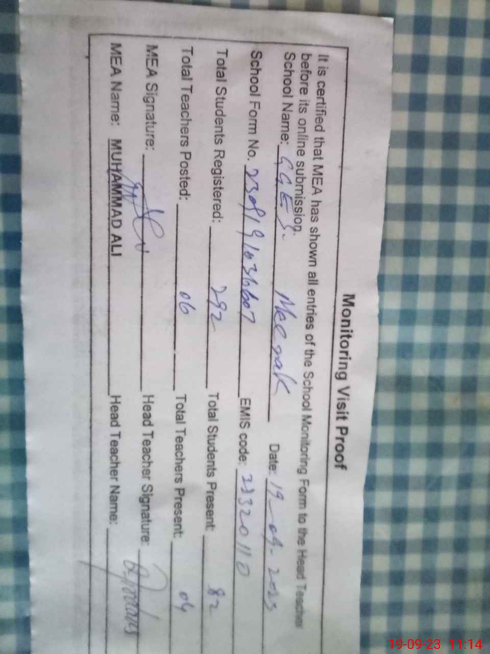 | Attendance Register | Head Teacher | MEA with School | Visit Proof |