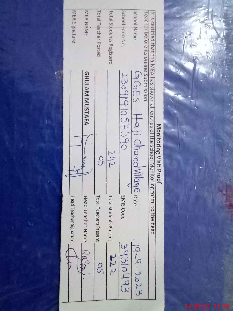 | Attendance Register | Head Teacher | MEA with School | Visit Proof |