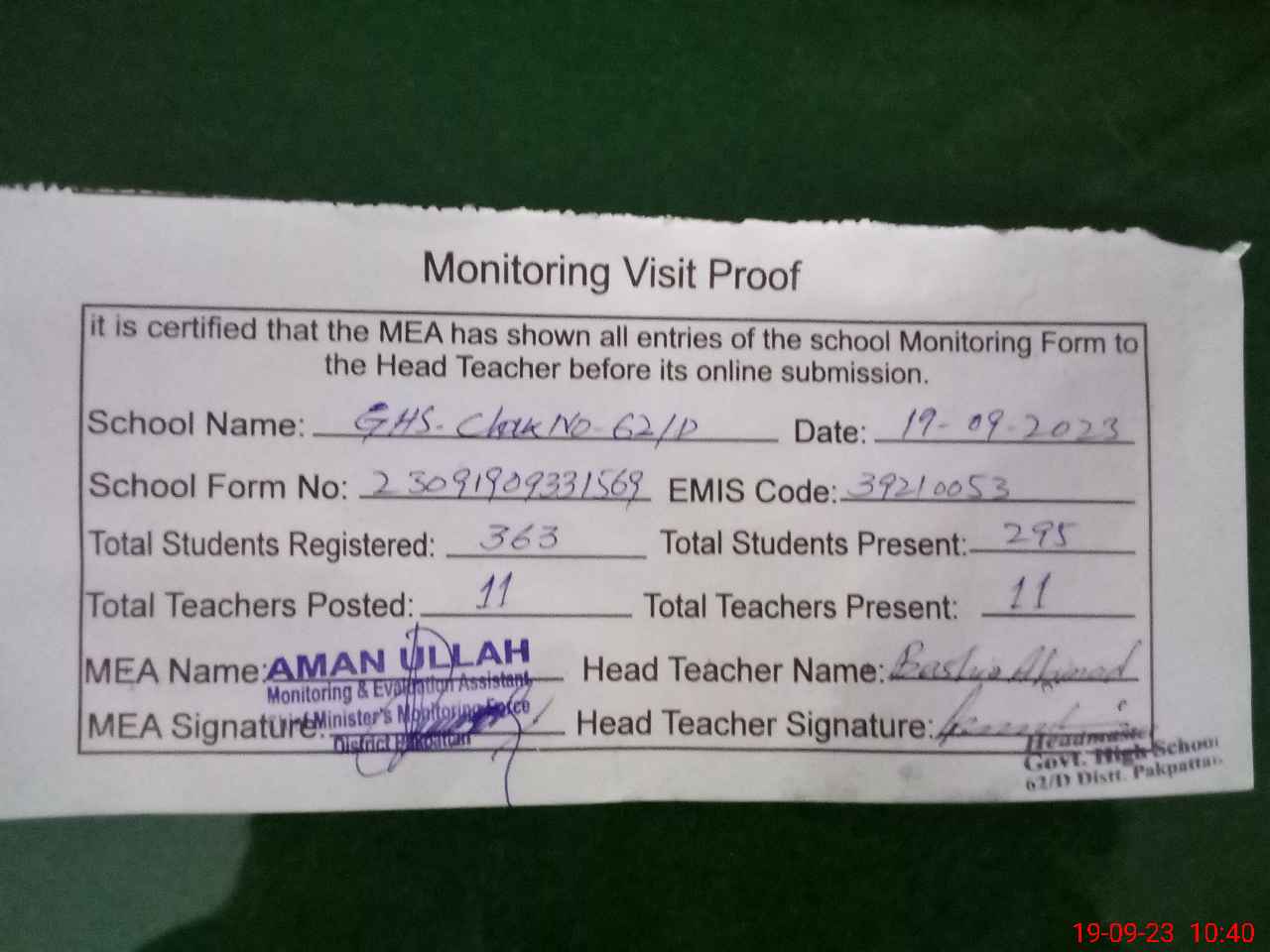 | Attendance Register | Head Teacher | MEA with School | Visit Proof |