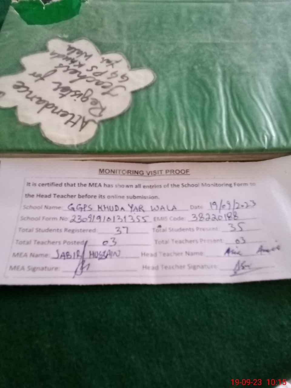 | Attendance Register | Head Teacher | MEA with School | Visit Proof |