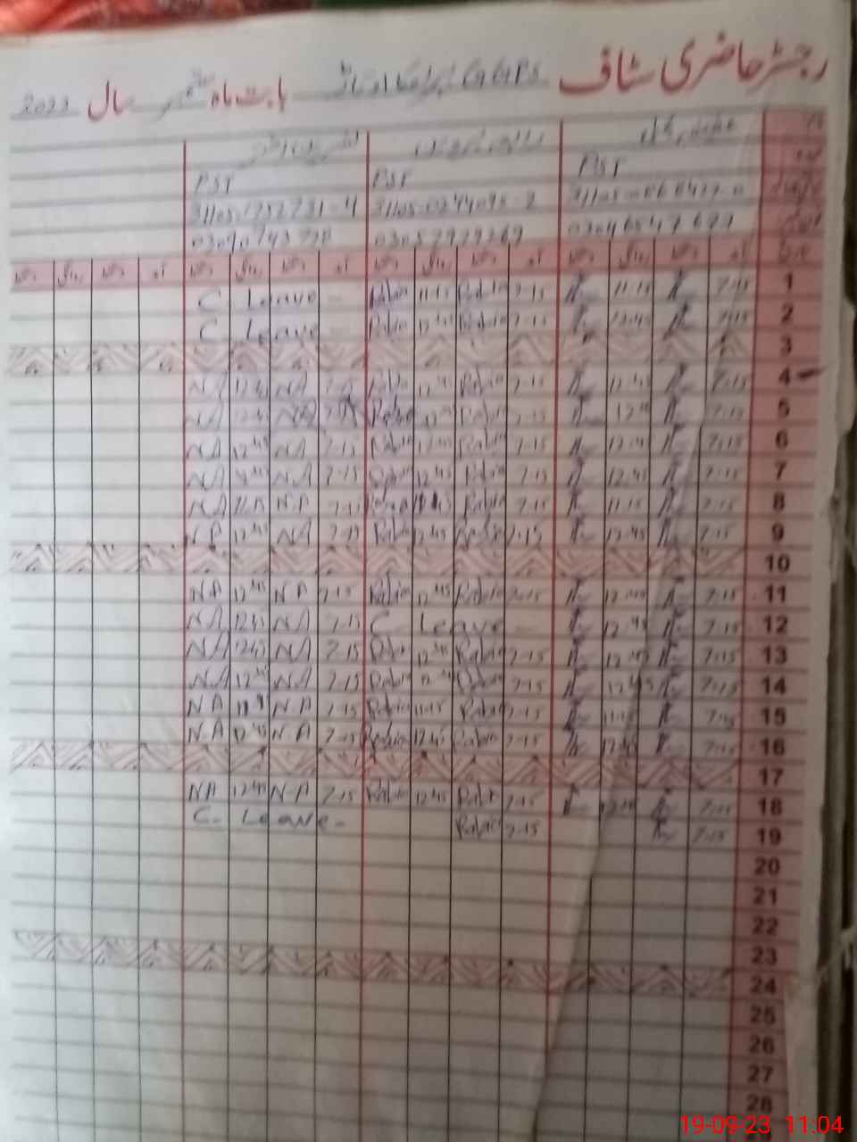 | CNIC | Full Name | Designation | R/C | Absence During Last Calender Month |