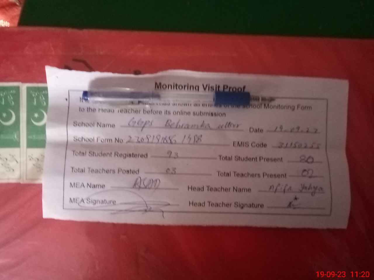 | Attendance Register | Head Teacher | MEA with School | Visit Proof |