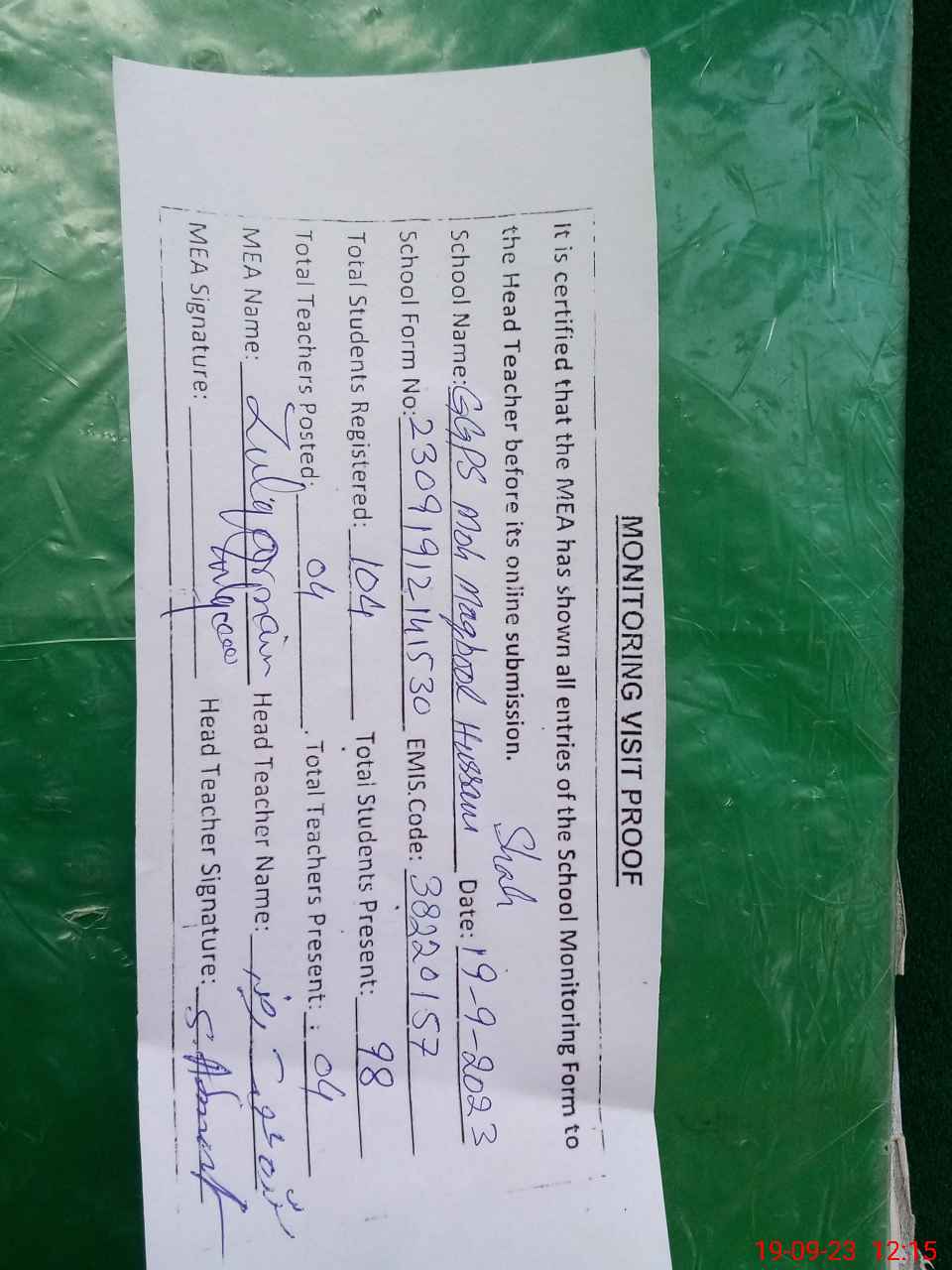 | Attendance Register | Head Teacher | MEA with School | Visit Proof |