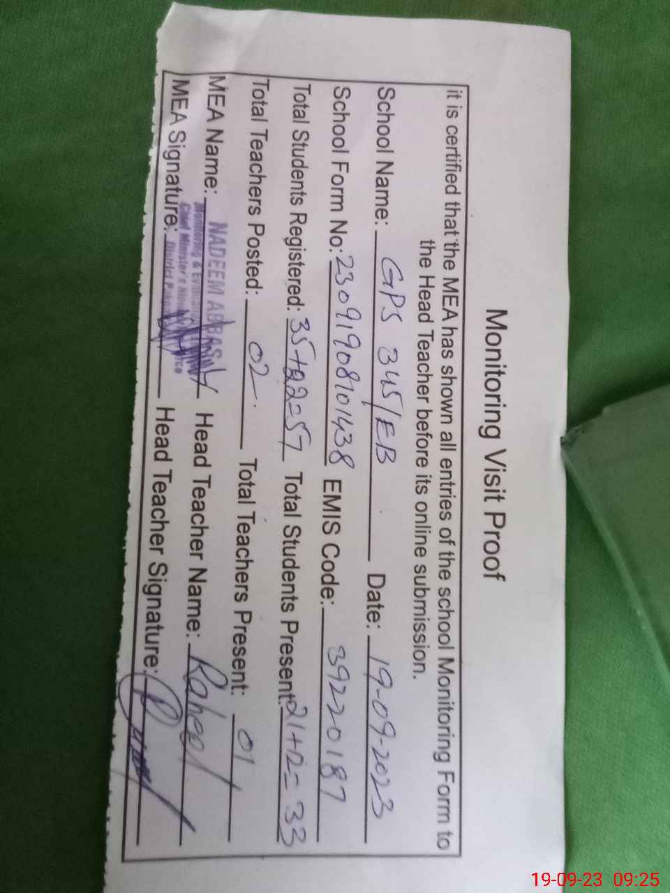 | Attendance Register | Head Teacher | MEA with School | Visit Proof |
