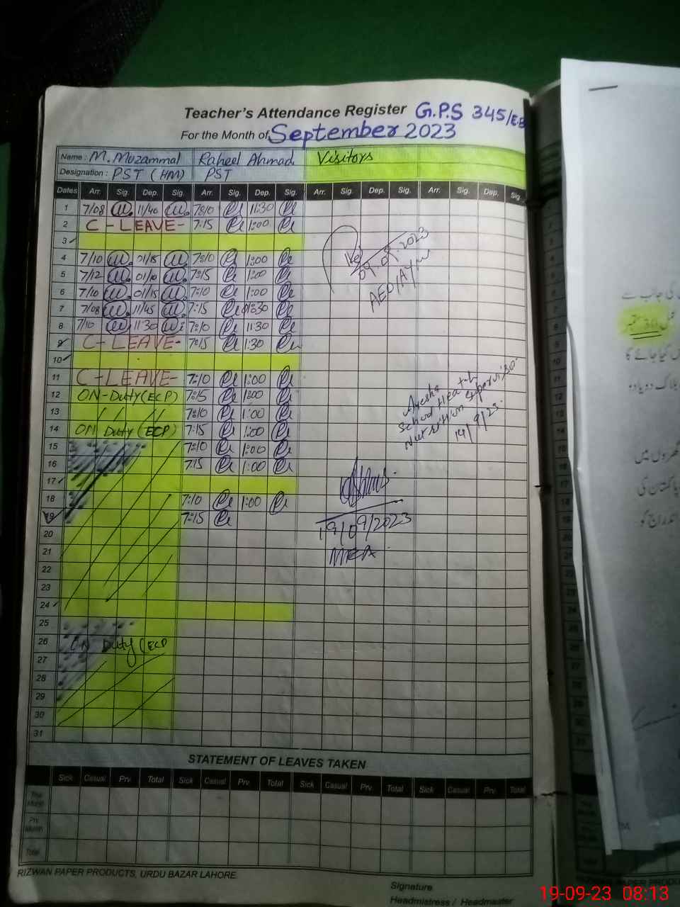 | Name: RA**** AH**** Designation: (School Headmaster's/Headmistress's) PST Phone/Cell Number: 03**** |