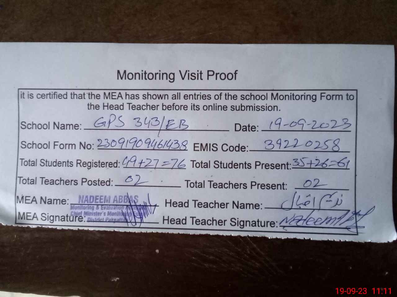 | Attendance Register | Head Teacher | MEA with School | Visit Proof |