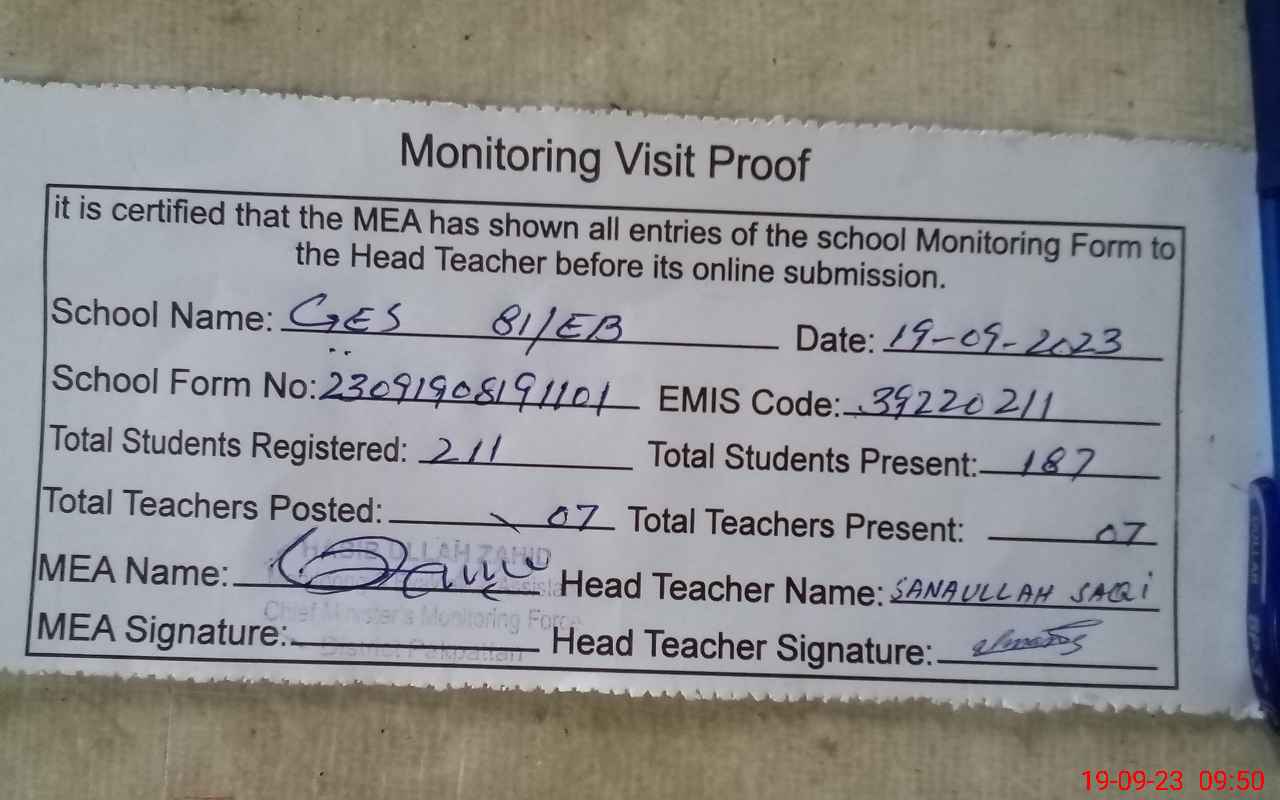 | Attendance Register | Head Teacher | MEA with School | Visit Proof |