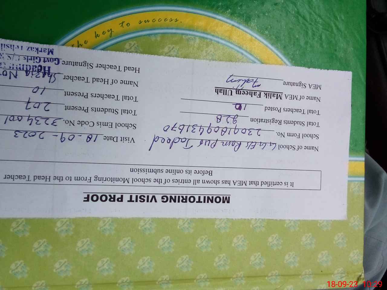 | Name: Az**** Pe**** Designation: (School Headmaster's/Headmistress's) EsT Phone/Cell Number: 03**** |
