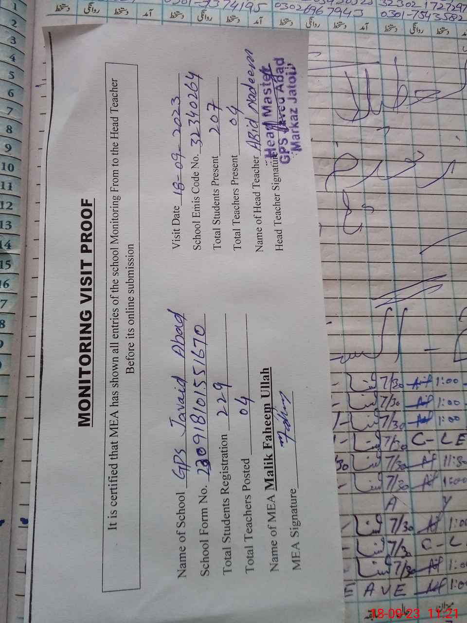 | Attendance Register | Head Teacher | MEA with School | Visit Proof |
