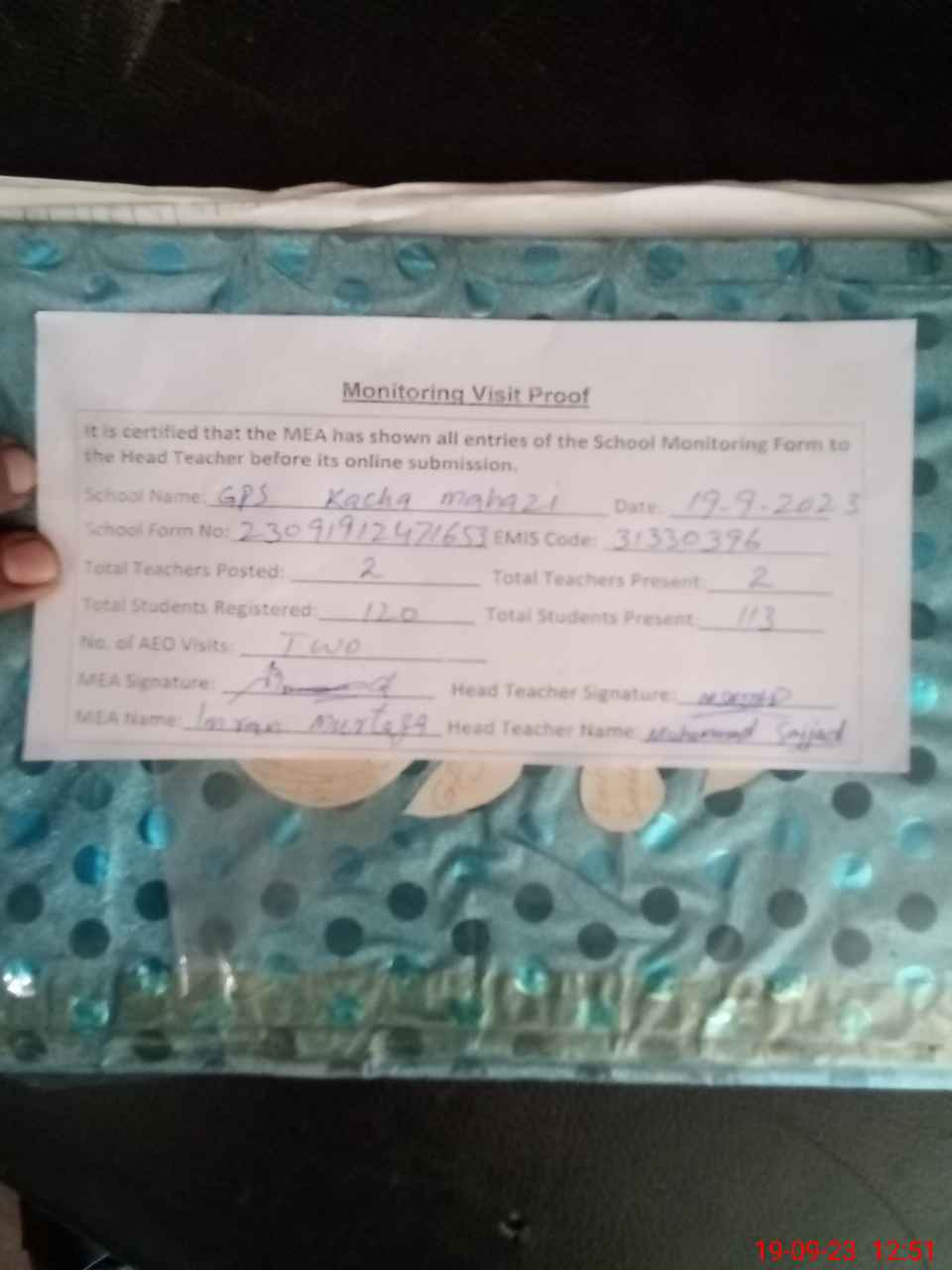 | Attendance Register | Head Teacher | MEA with School | Visit Proof |