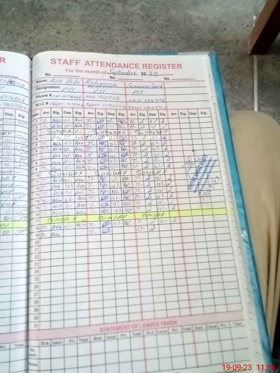 | CNIC | Full Name | Designation | R/C | Absence During Last Calender Month |