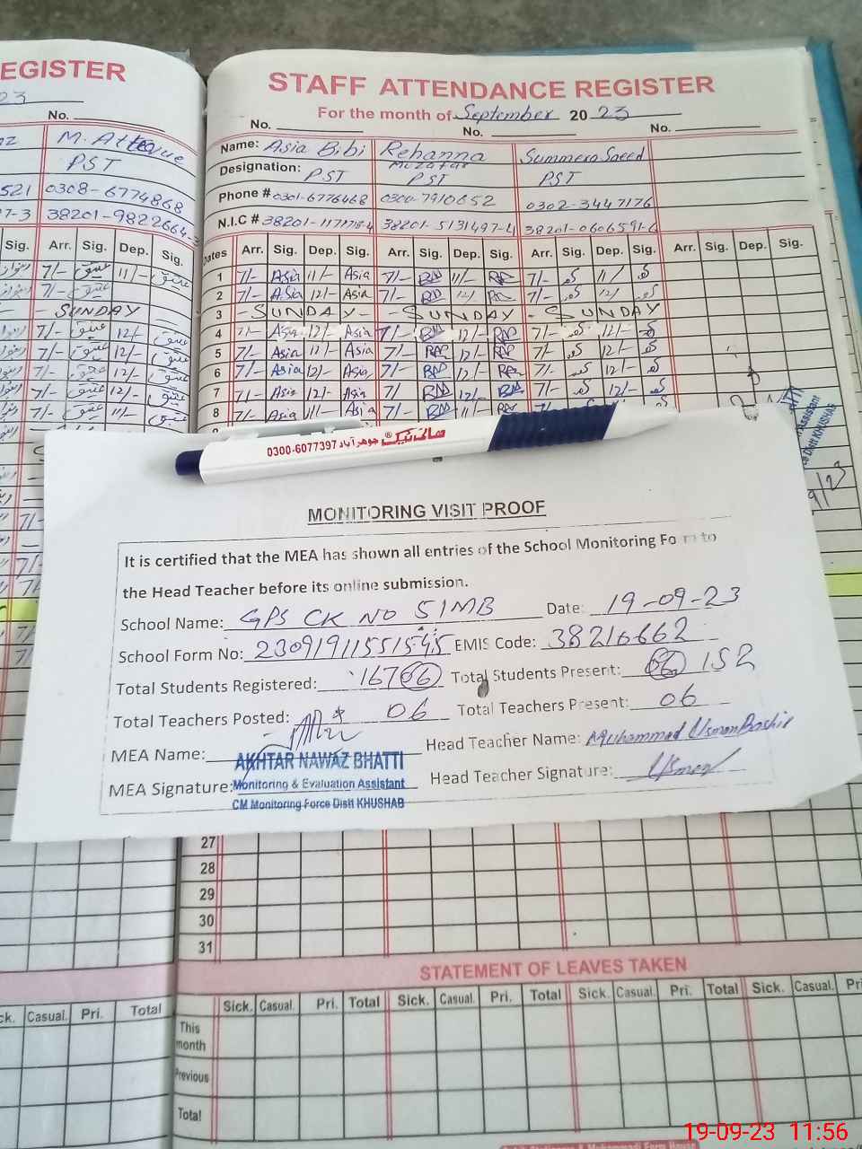 | Attendance Register | Head Teacher | MEA with School | Visit Proof |