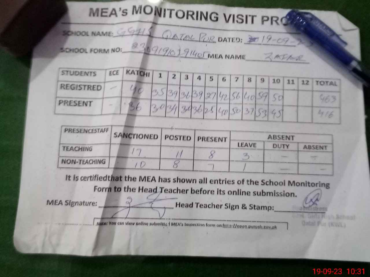| Attendance Register | Head Teacher | MEA with School | Visit Proof |