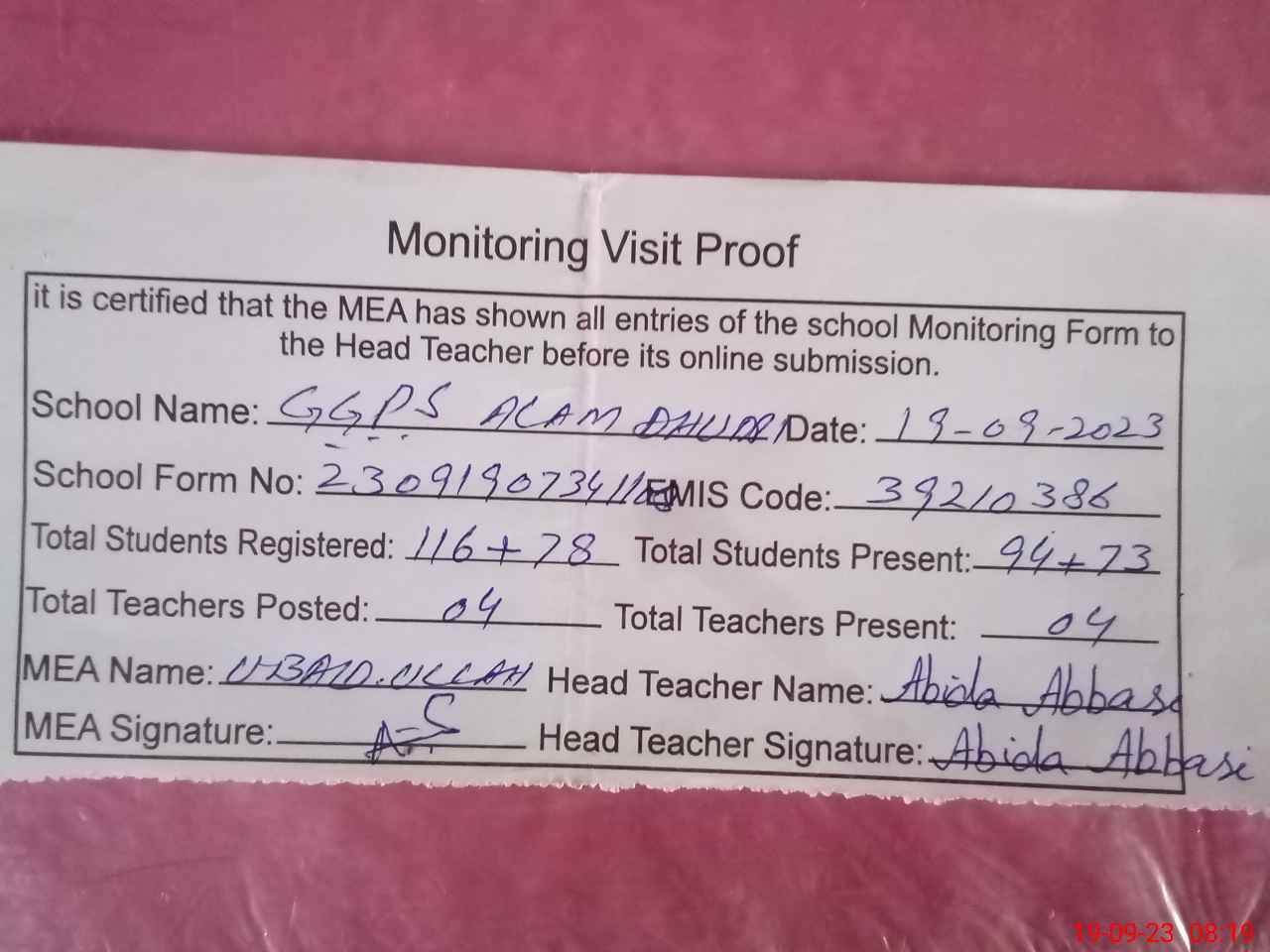 | Attendance Register | Head Teacher | MEA with School | Visit Proof |