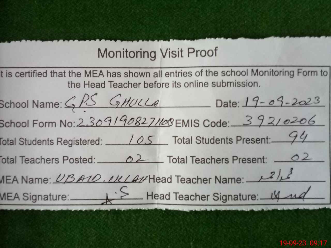 | Attendance Register | Head Teacher | MEA with School | Visit Proof |