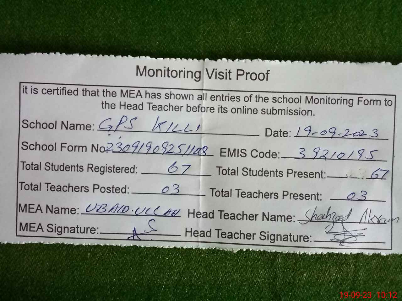 | Attendance Register | Head Teacher | MEA with School | Visit Proof |