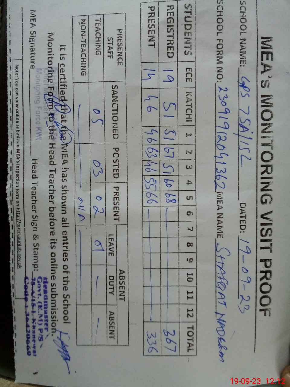 | Certified that this School was Inspected by the Undersigned MEA/DMO Today and the Information Stated Above is as Per Record. | |||||