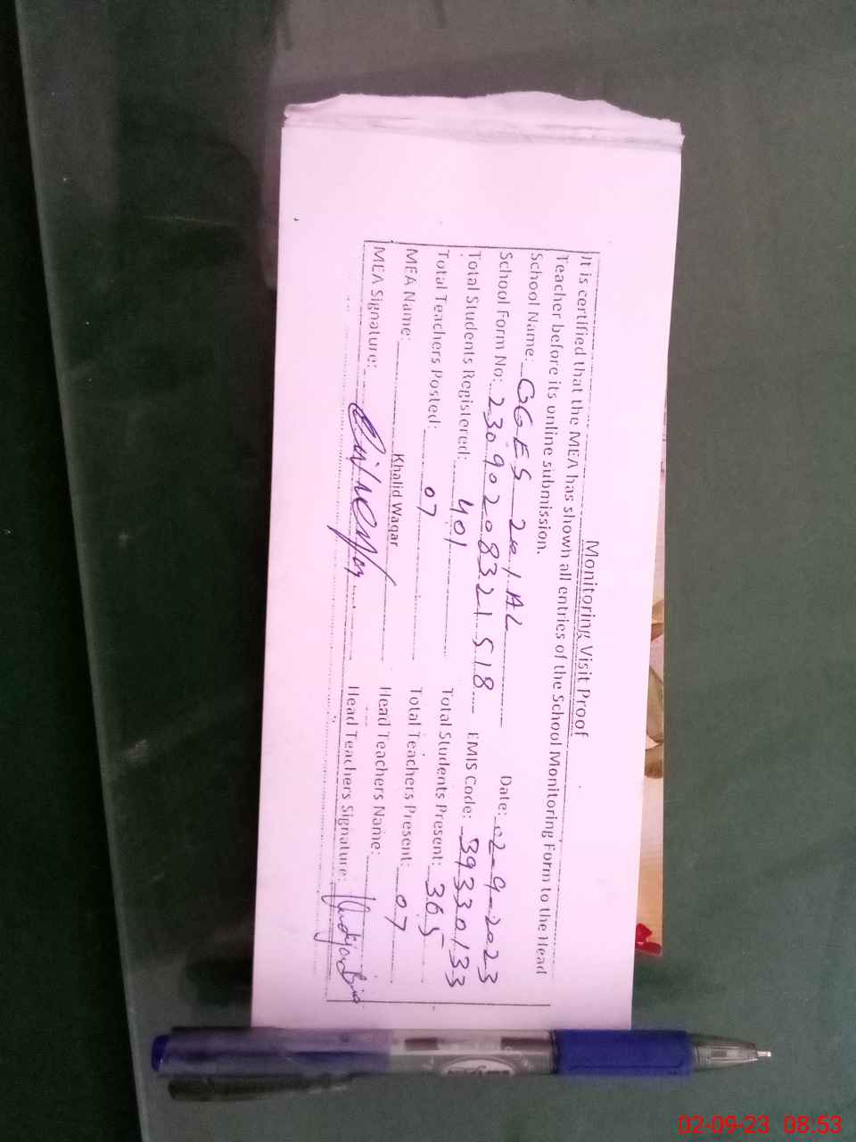 | Attendance Register | Head Teacher | MEA with School | Visit Proof |