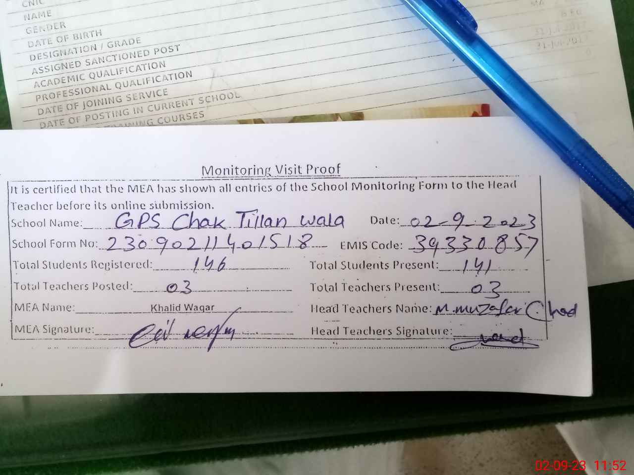 | Attendance Register | Head Teacher | MEA with School | Visit Proof |