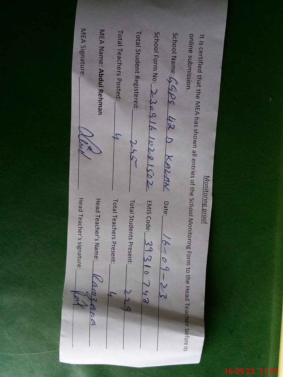 | EMIS Code: 39310748 | Name of School: GGES 42/D KALAN | |||