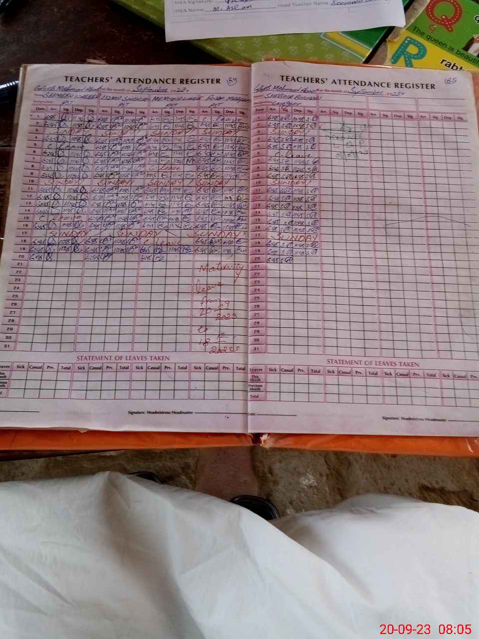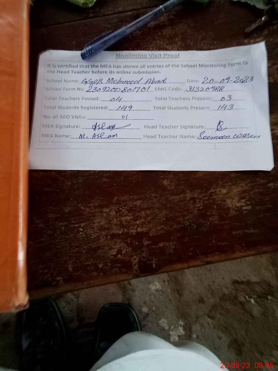 | Attendance Register | Head Teacher | MEA with School | Visit Proof |