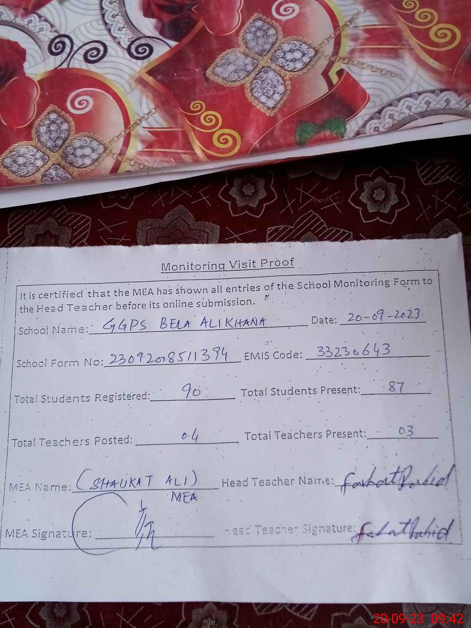 | Attendance Register | Head Teacher | MEA with School | Visit Proof |