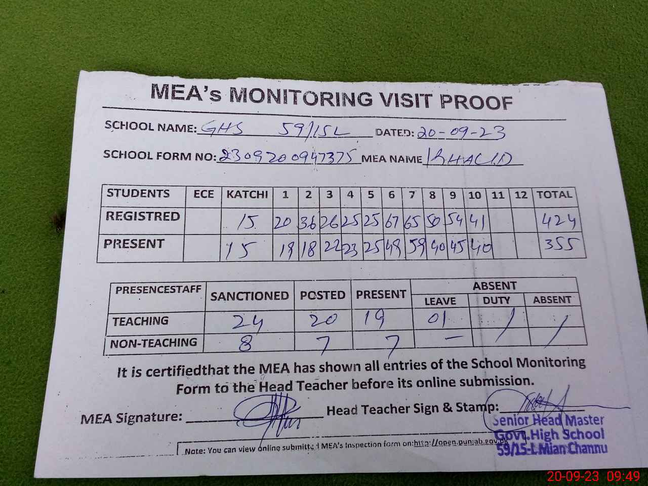 | Attendance Register | Head Teacher | MEA with School | Visit Proof |