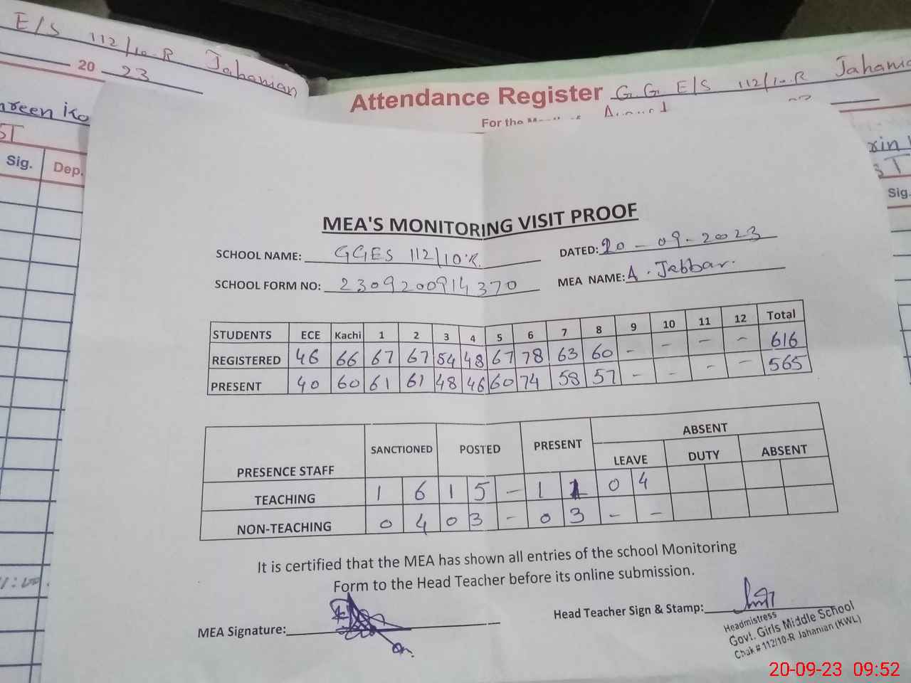 | Attendance Register | Head Teacher | MEA with School | Visit Proof |