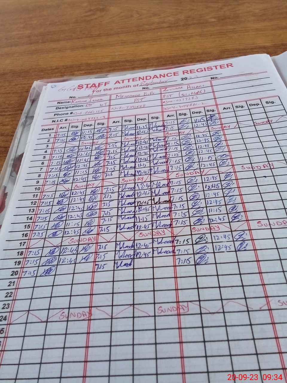 | CNIC | Full Name | Designation | R/C | Absence during last cal. month |