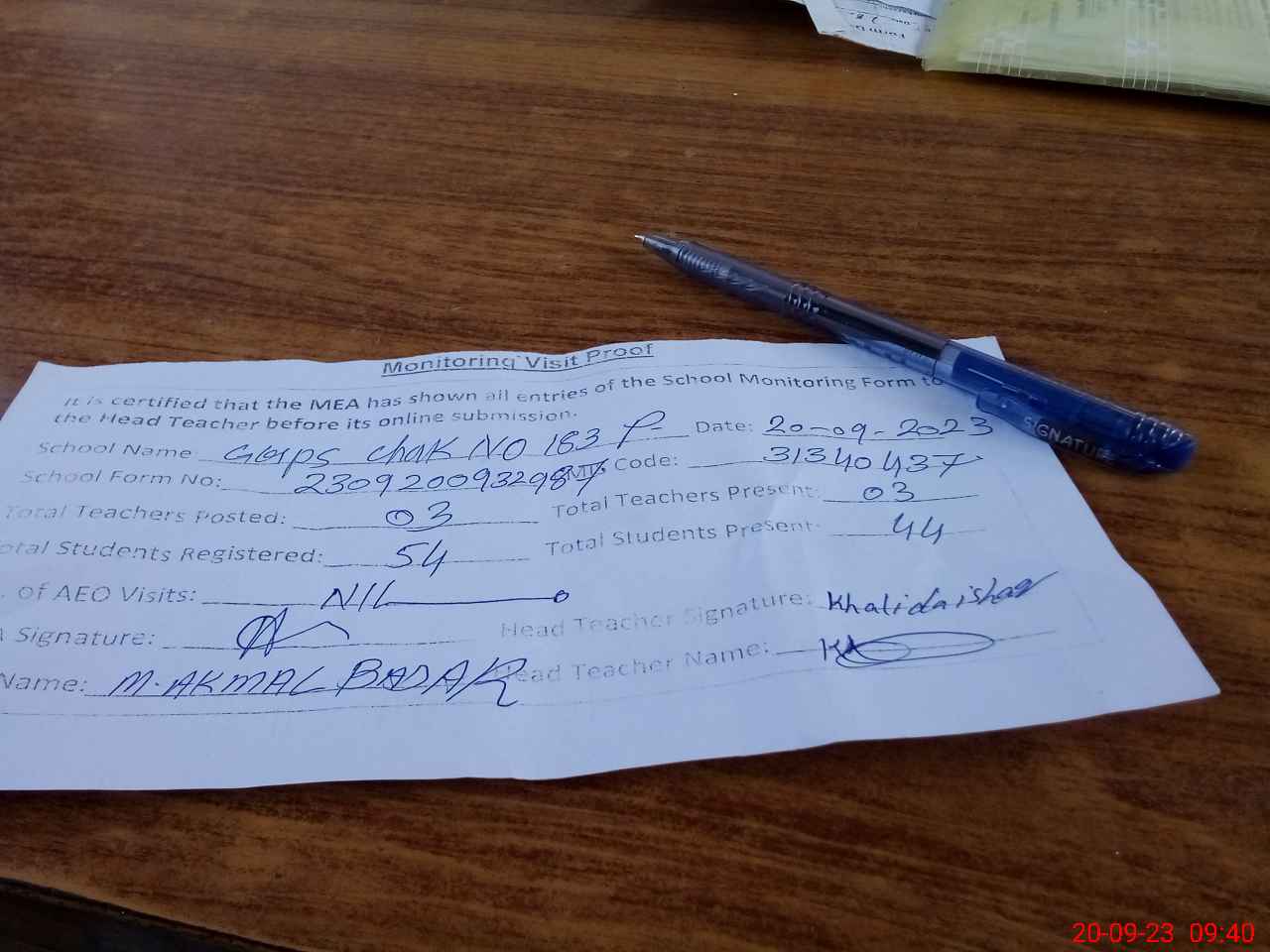| Attendance Register | Head Teacher | MEA with School | Visit Proof |