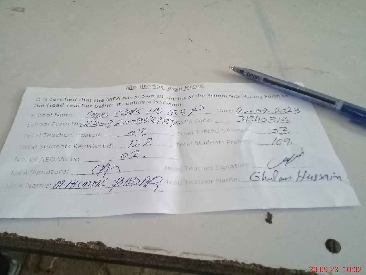 | EMIS Code: 31340313 | Name of School: GPS CHAK NO 183 | |||